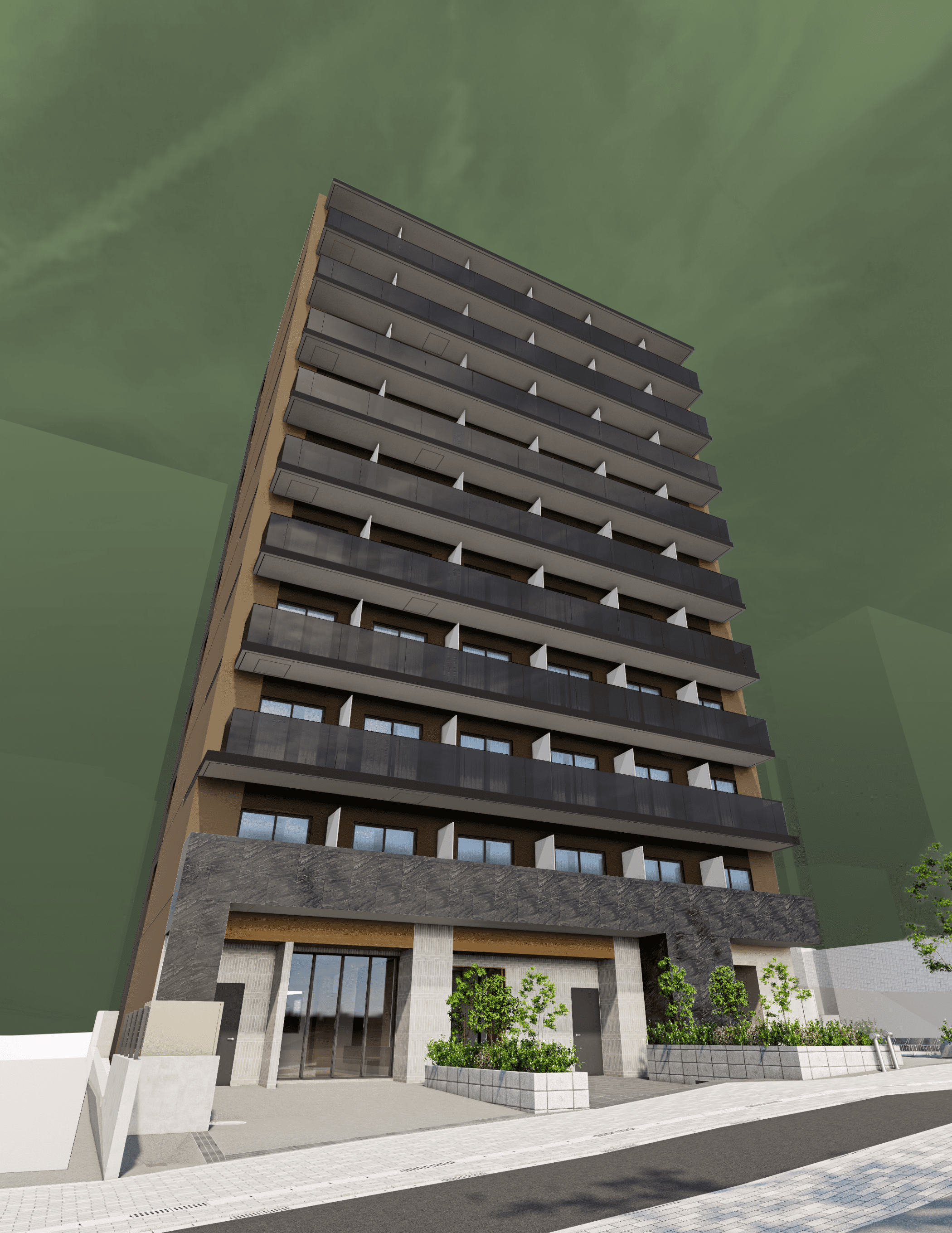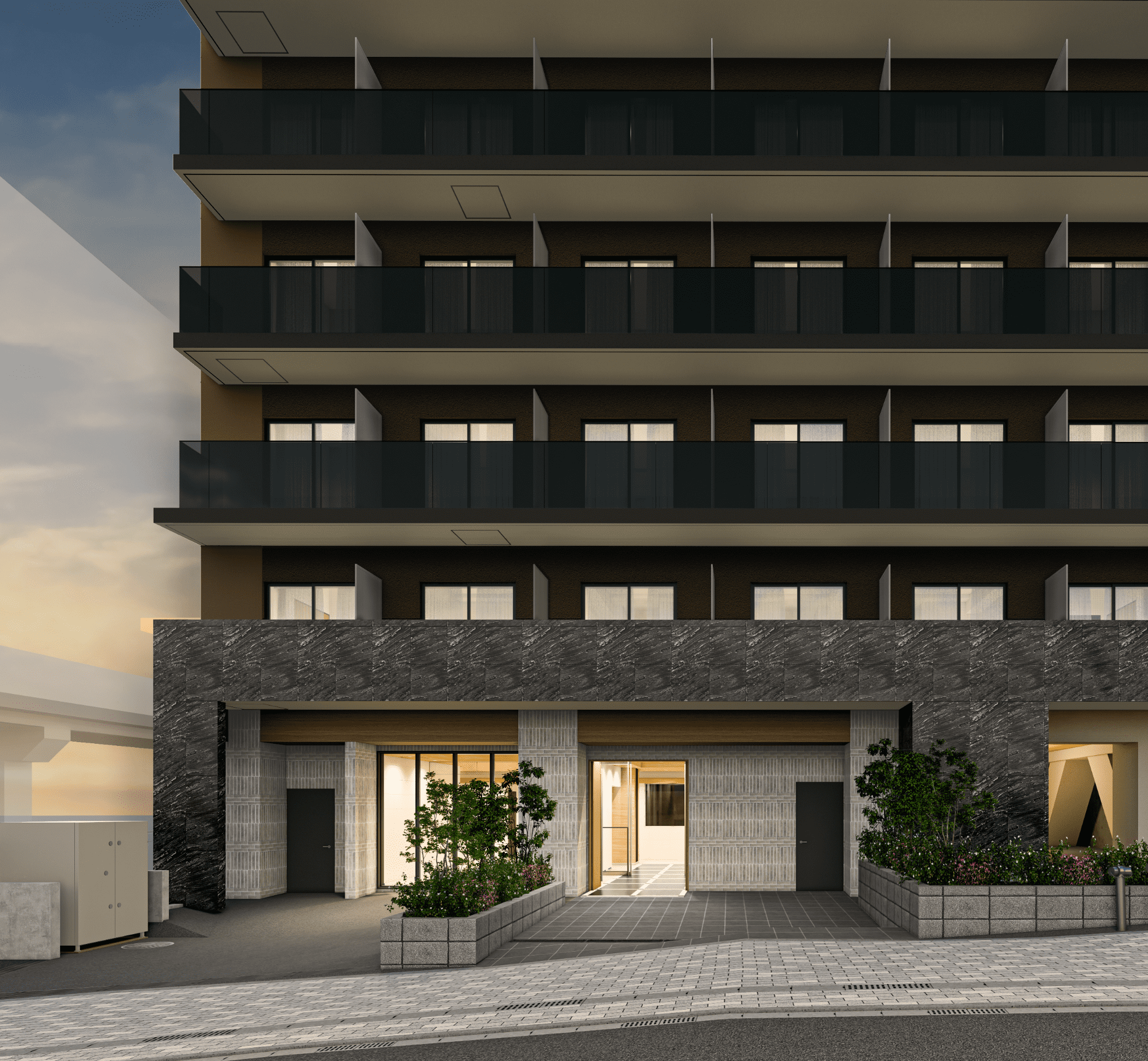 ハイグレードなSTYLEをより印象付けるために、チャコールグレーのタイルで設え重厚なるファサード。邸宅の顔となるエントランスには植栽を配し彩り演出。落ち着いた美意識を放ち、品格を感じられるデザインを目指しました。