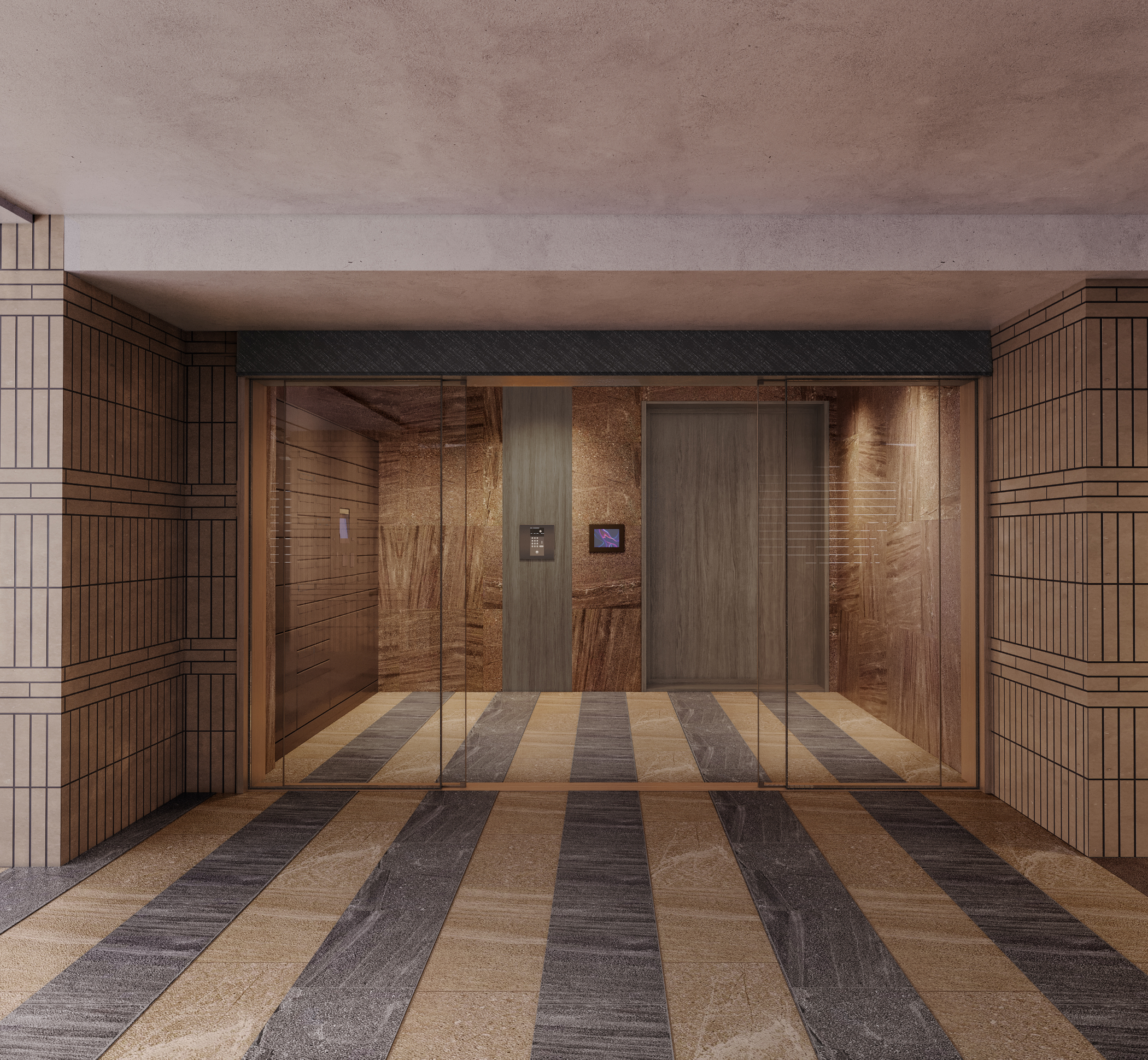 格子柄の壁面とボーダー柄の床材が、住まう方を持てなすように迎え入れる、ホテルライクなエントランス。個性を放つことも大切にしながら落ち着きも感じられる、美意識あふれる空間です。