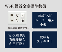 お部屋のインターネット差込口にLANケーブルを接続するだけの簡単設定。Wi-Fi接続もルーターの購入不要ですぐにご利用いただけます。