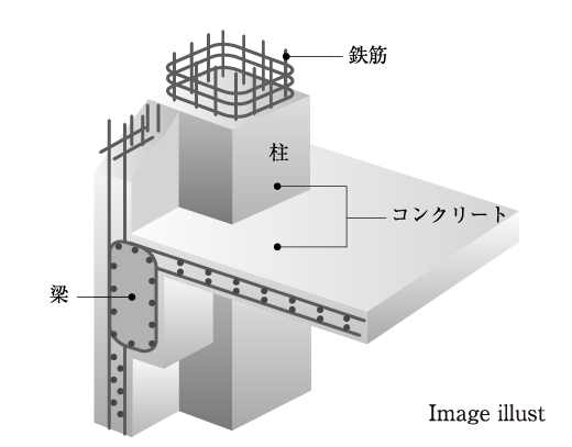 ■コンクリートセメントに、水、砂利、砂を加えて混ぜ合わせることにより、化学反応(水和反応)を起こし、固体化させたもので圧縮に対する強度が非常に大きく、主に建築物の荷重を支える構造材として多用されています。