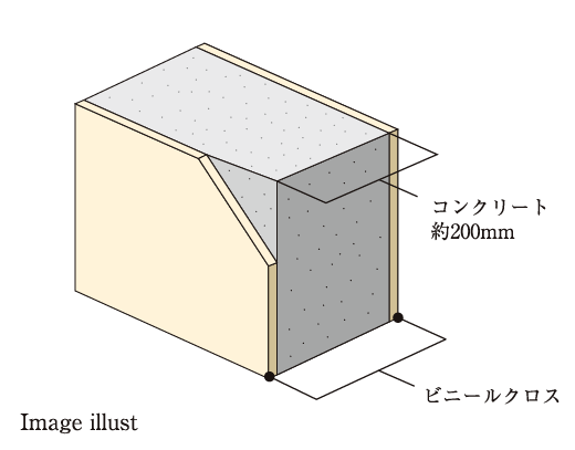 ■戸境壁(界壁)集合住宅の住戸と住戸の間を区切っている壁を戸境壁といいます。耐火性能、遮音性能の基準が法令により定められていて、特に防火、遮音性能が強く要求されます。各住戸の戸境壁にはコンクリート厚約200mmのものを使用することで隣戸の生活音の伝わりを軽減し、プライバシーや遮音性に配慮しています。