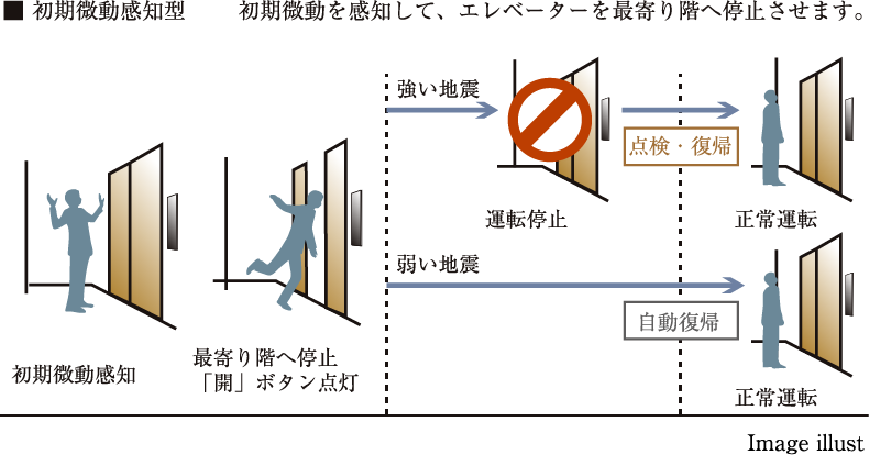地震の多いわが国ではマンションにもさまざまな対策が施されています。P波・S波センサー採用のエレベーター設置もその一つです。P波とは地震時に起こる初期微動のことで、S波とは本震のことです。そして、このエレベーターなら地震の初期微動を素早く感知し、大きな揺れ(本震)が来る前に最寄り階へ移動。扉が開き外に出られるシステムになっています。